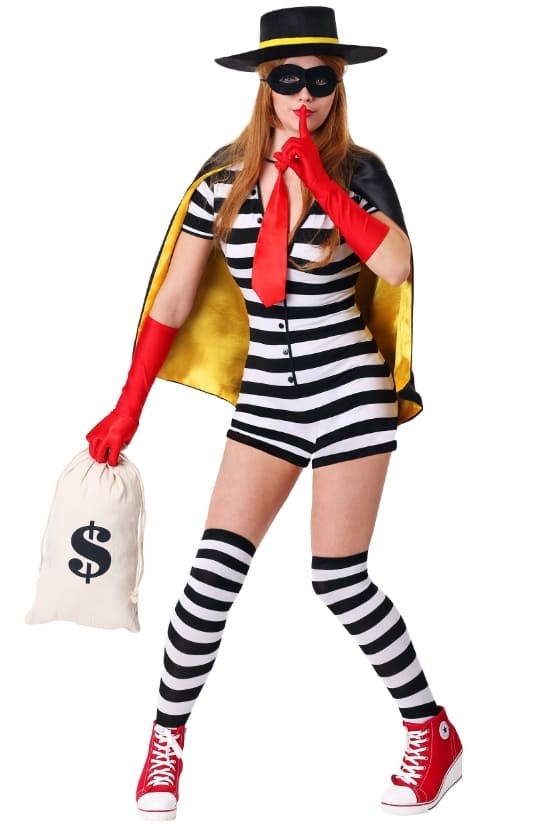 이 도난 방지 슈트에는 더 놀라운 세부 사항이 있습니다. 스트라이프 점프수트를 유니크하고 시크하게 디자인했고, 위에 골드 라인의 케이프를 레이어드해 고급스러운 룩을 연출했다. 빨간 넥타이와 장갑은 앙상블에 톡톡 튀는 색상을 더해 군중 속에서 당신을 돋보이게 합니다. 무릎 길이의 스트라이프 양말, 독특한 도둑 비니, 블랙 아이패치와 함께 매치하면 거부할 수 없는 룩을 연출할 수 있습니다.